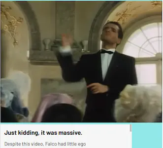 It’s true: Austria’s biggest pop star and Denmark’s most cinematic Amazon teamed up for a weird, horny Euro single in Body Next to Body. Falco was certainly busy in 1986, having released 2 albums (including the worldwide smash Rock Me Amadeus). Actress Brigitte Nielsen started her acting career in 1985, with Rocky 4 and Red Sonja opposite Stallone and Schwarzenegger. In 1987 she tried her hand at music, with the Kim Wilde-soundalike “Every Body Tells a Story”. It did well in Germany, Later that year came Body Next to Body with Falco (who was still a megastar in Austria and Germany). The track was written and produced by Giorgio Moroder (ah, he found more work!), which is surprising given the track is more guitar-forward than either his, Falco’s, or Nielsen’s recent output. Falco raps in the verses; unfortunately his usual energy is lacking and even to a non-German speaker like me its obvious he recycled some of his lyrics from the recent Sound of Musik). Nielsen responds in English - not the most inspired lyrics but delivered with good energy. Falco takes the lead with a more vocally-inspired English chorus, with Nielsen’s help. I don’t have much else to say about the lyrics except that they straightforward about sex. The lyric “turn the pain to pleasure” adds to the… intensity. Falco later claimed—half-jokingly, perhaps—that he only agreed to record Body Next to Body to sleep with Nielsen. Whether or not that was true, the collaboration made perfect sense for two oversized personalities from the continental European scene.